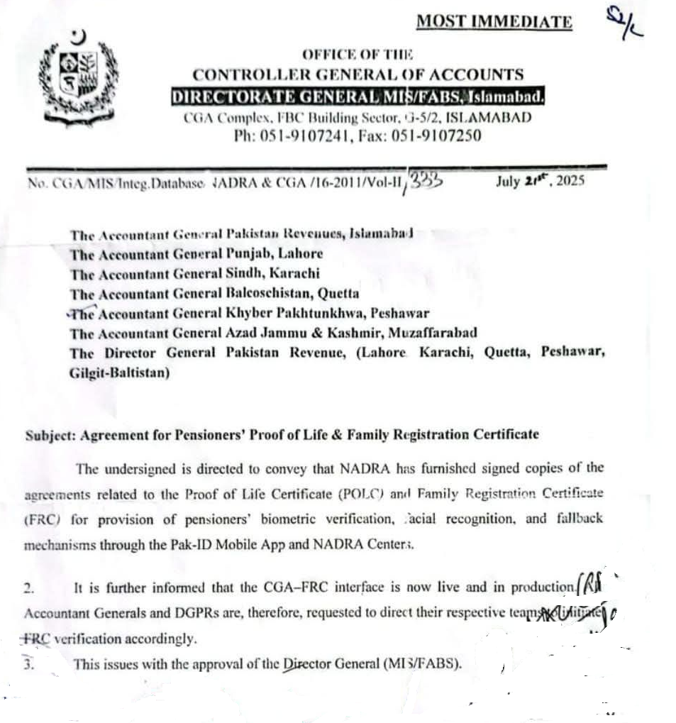 Furthermore, it is conveyed that the CGA-FRC interface is now live and operational in the production environment. Accountant Generals and DGPRs are accordingly requested to instruct their respective teams to commence FRC verification without delay.