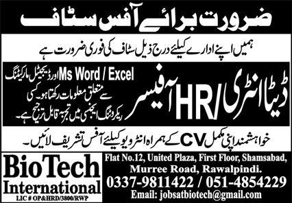 Biotech International Rawalpindi Jobs 2025 For HR Officer. BioTech International is hiring for the following positions, as advertised in the Daily Express Newspaper dated August 27, 2025. The jobs are based at Shams Abad, Rawalpindi, Punjab, Pakistan: