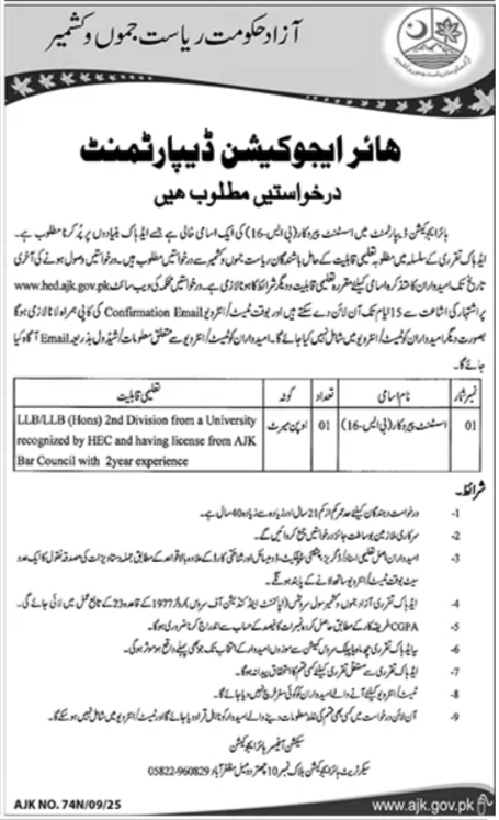 Higher Education Department. The Higher Education Department is inviting applications for the position of Assistant, as advertised in the Daily Dunia newspaper dated September 3, 2025, for its office located in Muzaffarabad, AJ&K.