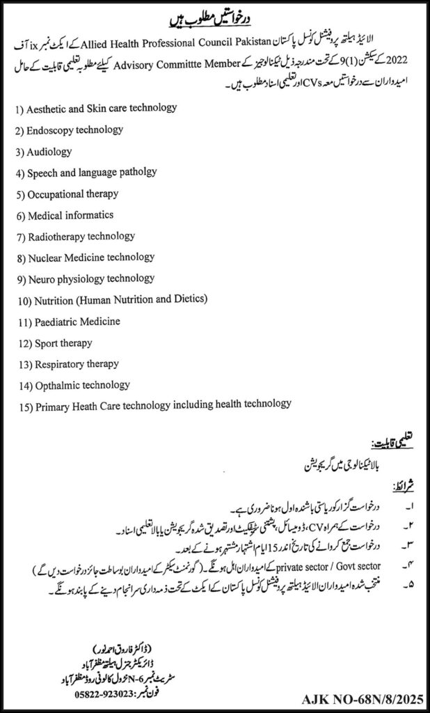 Job Vacancies At Director General Health Services. The Director General Health Services is inviting applications for the position of Advisory Committee Member, as advertised in the Other newspaper dated August 23, 2025. The position is based in Muzaffarabad, AJK, Pakistan.