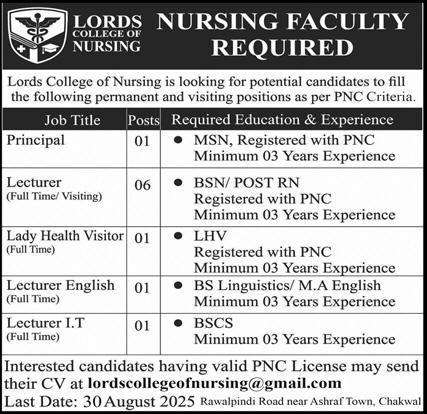 Lords College Of Nursing Chakwal Jobs 2025 For Lecturers. Lords College of Nursing (Ashraf Town, Chakwal, Punjab) is inviting applications for various positions as advertised in the Daily Express on August 26, 2025. The available vacancies include:
