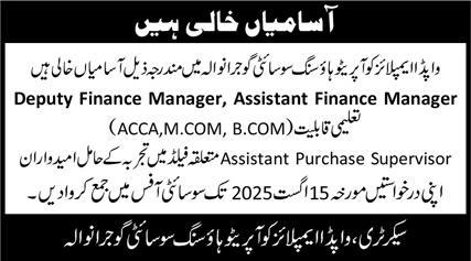 WAPDA Employees Cooperative Housing Society, located in WAPDA Town, Gujranwala, Punjab, is inviting applications for the following finance positions, as advertised in the Daily Express newspaper dated August 13, 2025: