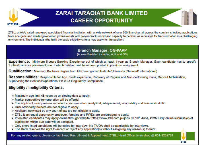 Zarai Taraqiati Bank Limited Branch Manager Jobs 2025