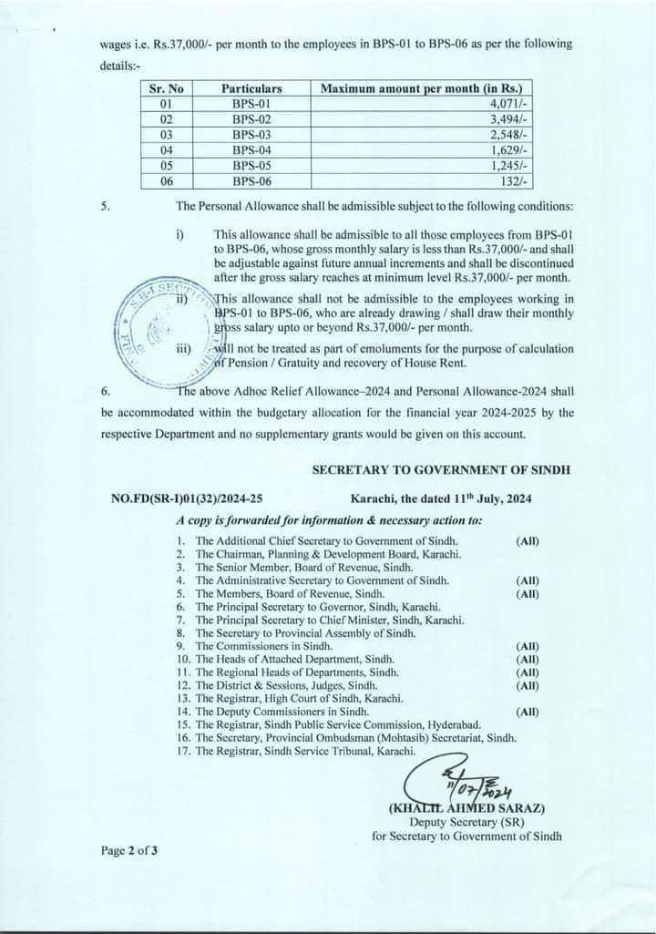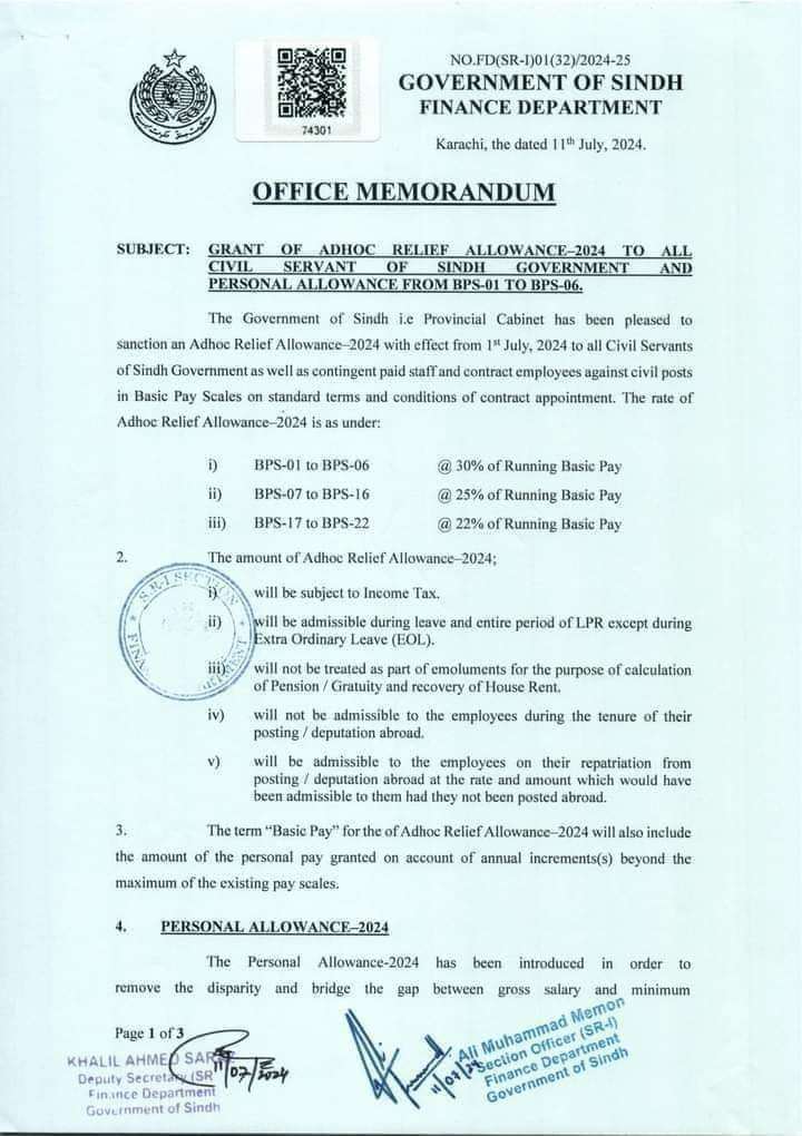 Notification Adhoc Relief Allowance 2024 Sindh and Personal Allowance BPS-01 to BPS-06 May 29, 2025 by nabx1331@gmail.com Notification Adhoc Relief Allowance 2024 Sindh and Personal Allowance BPS-01 to BPS-06