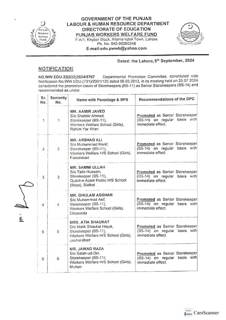 Notification Promotion Storekeepers (BPS-11) as Senior Storekeepers (BPS-14) Punjab Workers Welfare Fund July 23, 2025 by nabx1331@gmail.com Notification Promotion Storekeepers (BPS-11) as Senior Storekeepers (BPS-14) Punjab Workers Welfare Fund Notification Promotion Storekeepers (BPS-11) as Senior Storekeepers (BPS-14) Punjab Workers Welfare Fund See More: