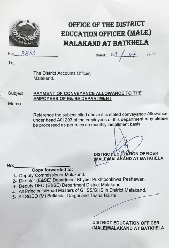 Payment of Conveyance Allowance to E&SE Employees – Malakand Notification